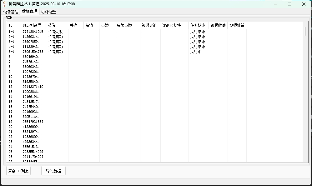 抖音群控留痕系统支持全自动一键批量关注、私信、点赞、评论、收藏等操作。你只需轻点鼠标,即可实现50台手机同步执行指令,大大提高了工作效率。无需繁琐的手动操作,一台电脑即可轻松掌控全局。
