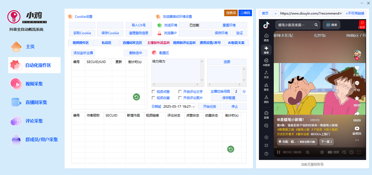 4.导入主播主页链接,开启监听,批量监控多个主播发布的新作品并通知,然后批量自动化评论点赞收藏。