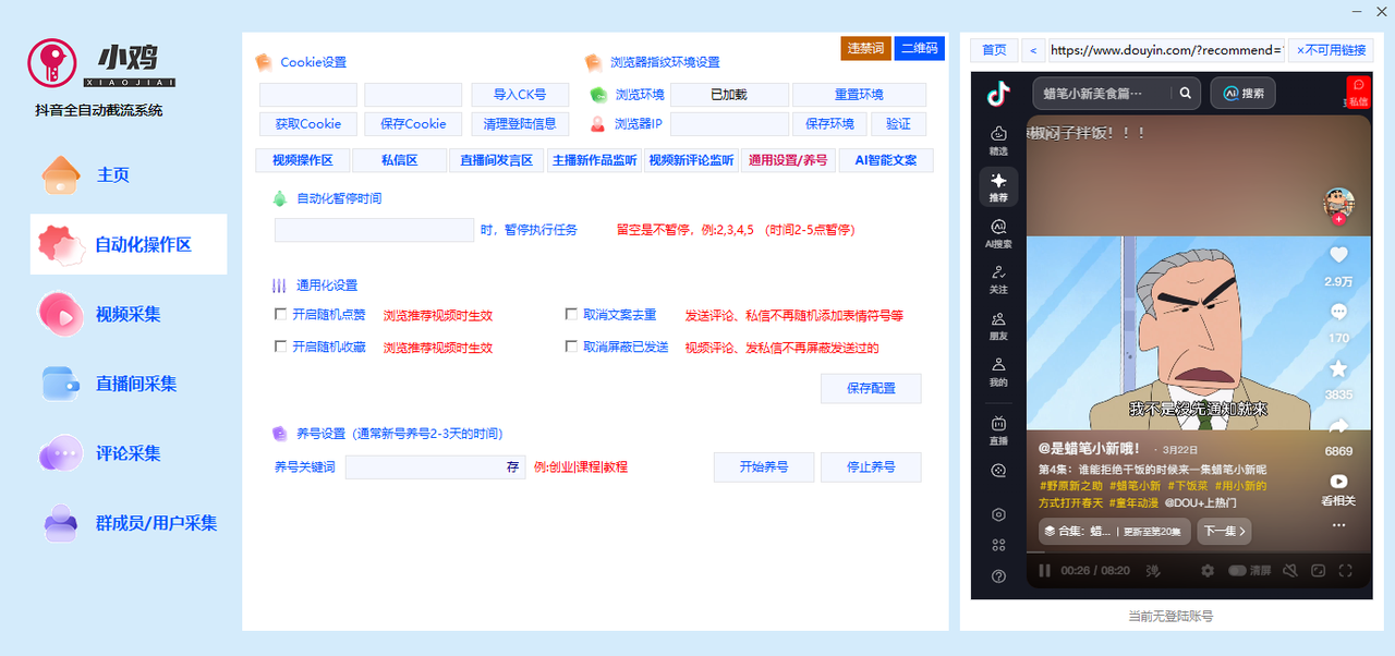 7.自动化养号:配置时间,勾选随机点赞和随机收藏以及随机文案去重。批量自动化浏览视频并随机点赞收藏,增加账号权重。
