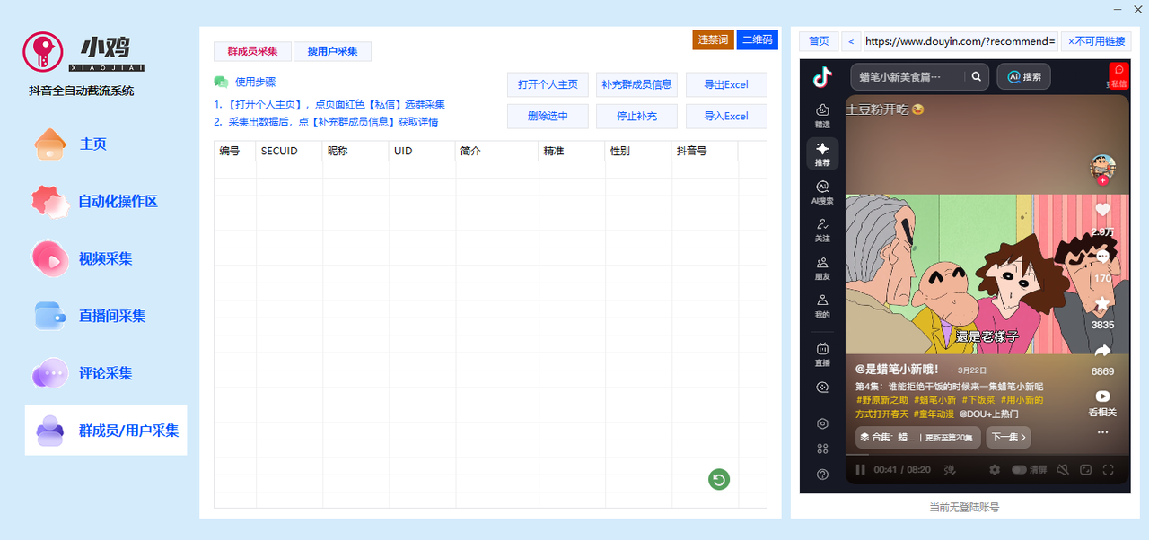 一款抖音综合多功能引流脚本软件,可批量搜索关键字采集视频,批量采集视频评论,批量采集主页群成员,批量采集主播主页粉丝等多种截留采集功能。将采集到的id自动一键导入自动化操作区进行视频评论点赞收藏,批量关注私信用户,批量导入直播间链接进行发言等功能。监控主播新作品和视频评论并进行通知以及自动化随机看视频养号,抖音直播间弹幕采集工具等等多种功能为一体的抖音引流神器。