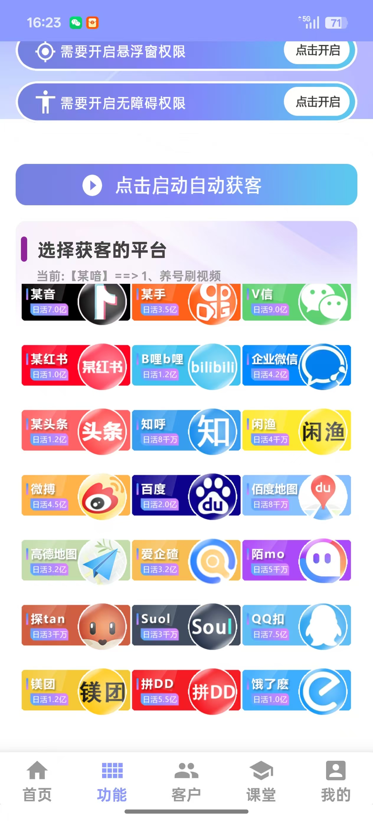 【AI获客5.0】是一款安装在安卓Android/鸿蒙HarmonyOS手机上运行的引流获客软件,支持真机,模拟器,云手机环境下运行。目前支持获客的平台有抖音/快手/小红书/知乎/今日头条/哔哩哔哩/微信/QQ/闲鱼/微博/优酷/百度/百度贴吧/西瓜视频/陌陌/探探/soul/好看视频/豆瓣/爱奇艺/腾讯视频/芒果TV/美团/拼多多/饿了么/搜狐视频等30+主流平台的180多种引流截留采集获客功能,主要功能有采集、养号、同城采集、关注、私信、截留、留痕。模拟人工操作,解放双手 提高工作效率。