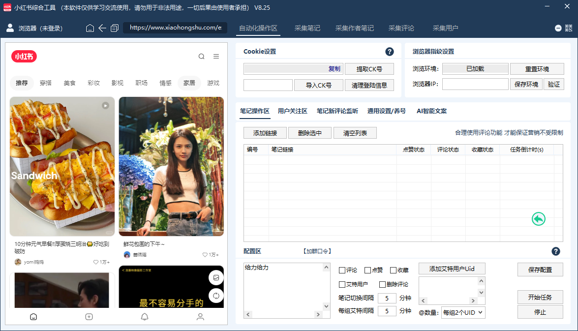 功能一:笔记操作,评论点赞,收藏(全自动笔记打广告,可设置单笔记间隔时间长)