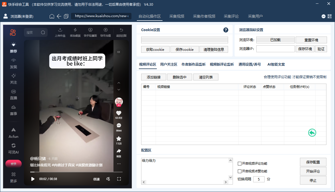 1.批量导入视频链接进行批量评论,可自定义设置评论间隔时间和随机内容